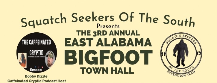 A lively community town hall hosted by Squatch Seekers focused on Bigfoot sightings, stories, and Sasquatch lore, billed as the East Alabama Bigfoot Town Hall and designed for fans to share encounters and discuss regional reports.