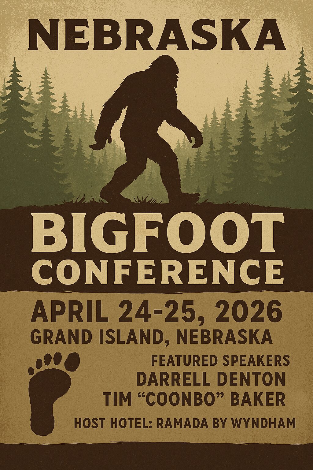 The Nebraska Bigfoot Conference will be held April 24–25, 2026, at the Aurora Cooperative Pavilion in Grand Island, Nebraska. It’s the 8th annual gathering, hosted by Harriett McFeely (“The Bigfoot Lady”) and the Bigfoot Crossroads of America Museum and Research Center.