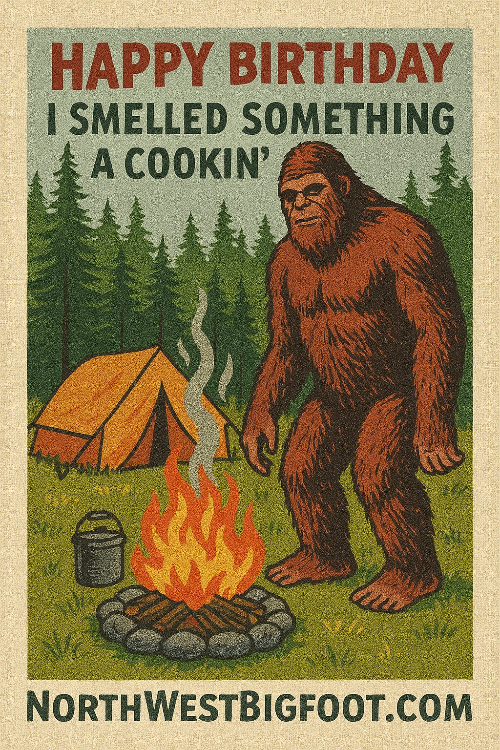 Brighten someone’s day with the Bigfoot Birthday eCard — Camping in the Woods #1, a playful, downloadable greeting that sends legendary birthday wishes straight from the Northwest woods. This eCard features a cheeky Bigfoot illustration, a fun hand-lettered headline, and a warm, whimsical tone that works for friends, family, and fellow cryptid fans.