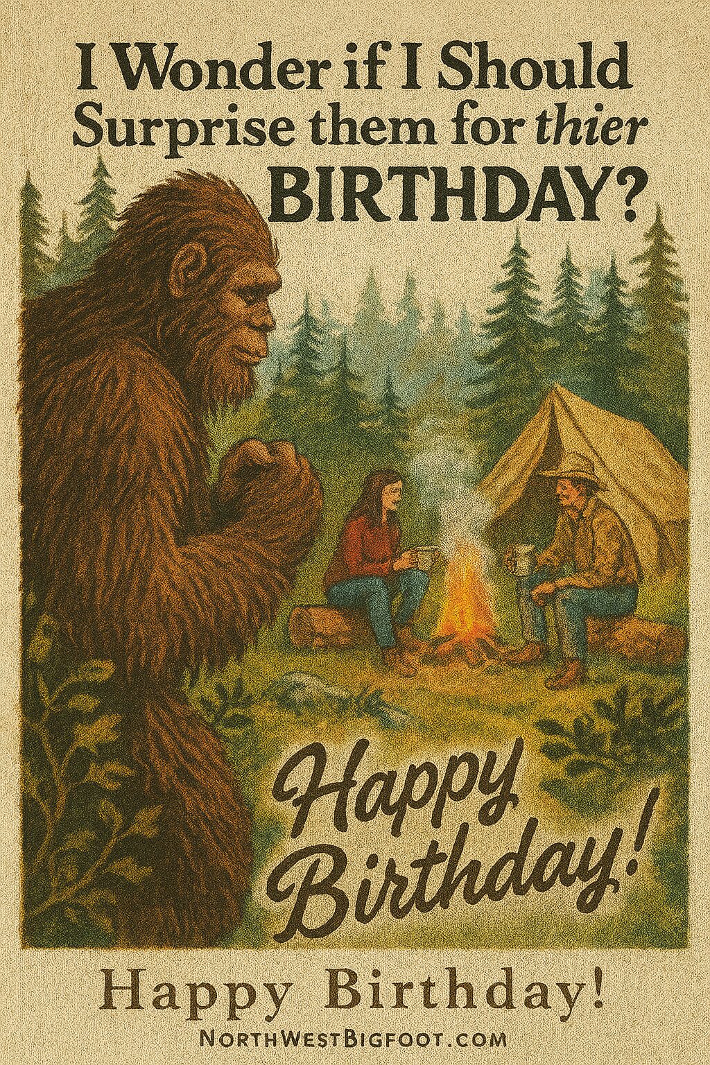 Brighten someone’s day with the Bigfoot Birthday eCard — Camping in the Woods #2, a playful, downloadable greeting that sends legendary birthday wishes straight from the Northwest woods. This eCard features a cheeky Bigfoot illustration, a fun hand-lettered headline, and a warm, whimsical tone that works for friends, family, and fellow cryptid fans.