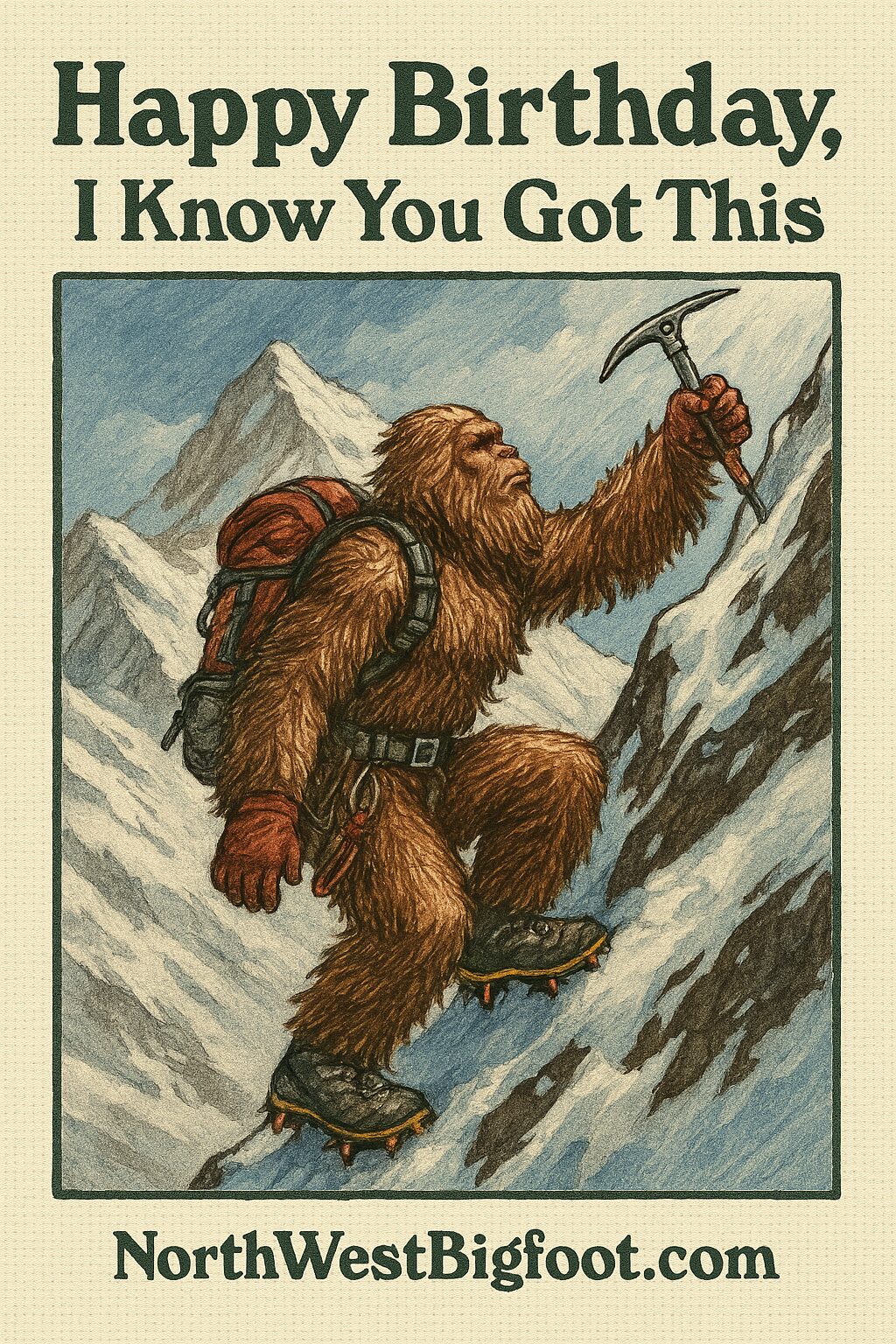Brighten someone’s day with the Bigfoot Birthday eCard — Climbing the Mountains #1, a playful, downloadable greeting that sends legendary birthday wishes straight from the Northwest woods. This eCard features a cheeky Bigfoot illustration, a fun hand-lettered headline, and a warm, whimsical tone that works for friends, family, and fellow cryptid fans.