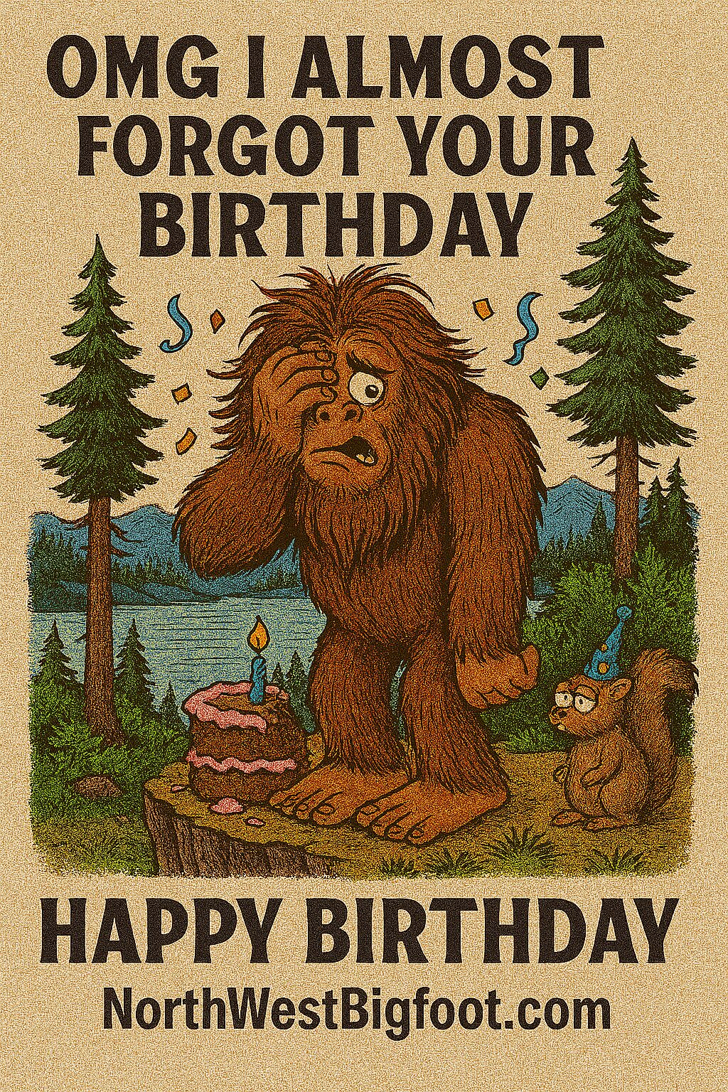 Brighten someone’s day with the Bigfoot Birthday eCards – I Almost Forgot Your Birthday #10, a playful, downloadable greeting that sends legendary birthday wishes straight from the Northwest woods. This eCard features a cheeky Bigfoot illustration, a fun hand-lettered headline, and a warm, whimsical tone that works for friends, family, and fellow cryptid fans.